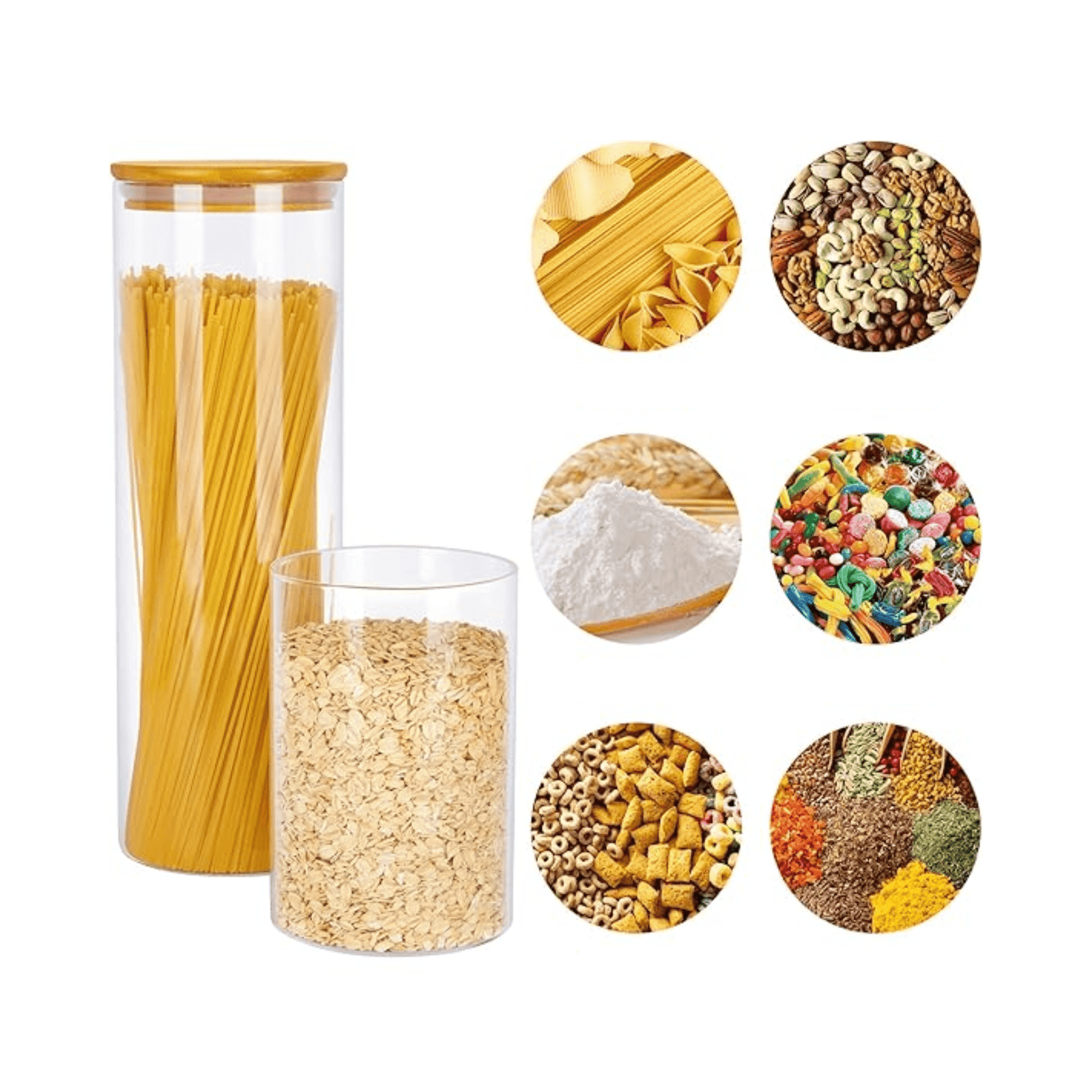 Elegant glass jars with bamboo lids for stylish pantry storage.