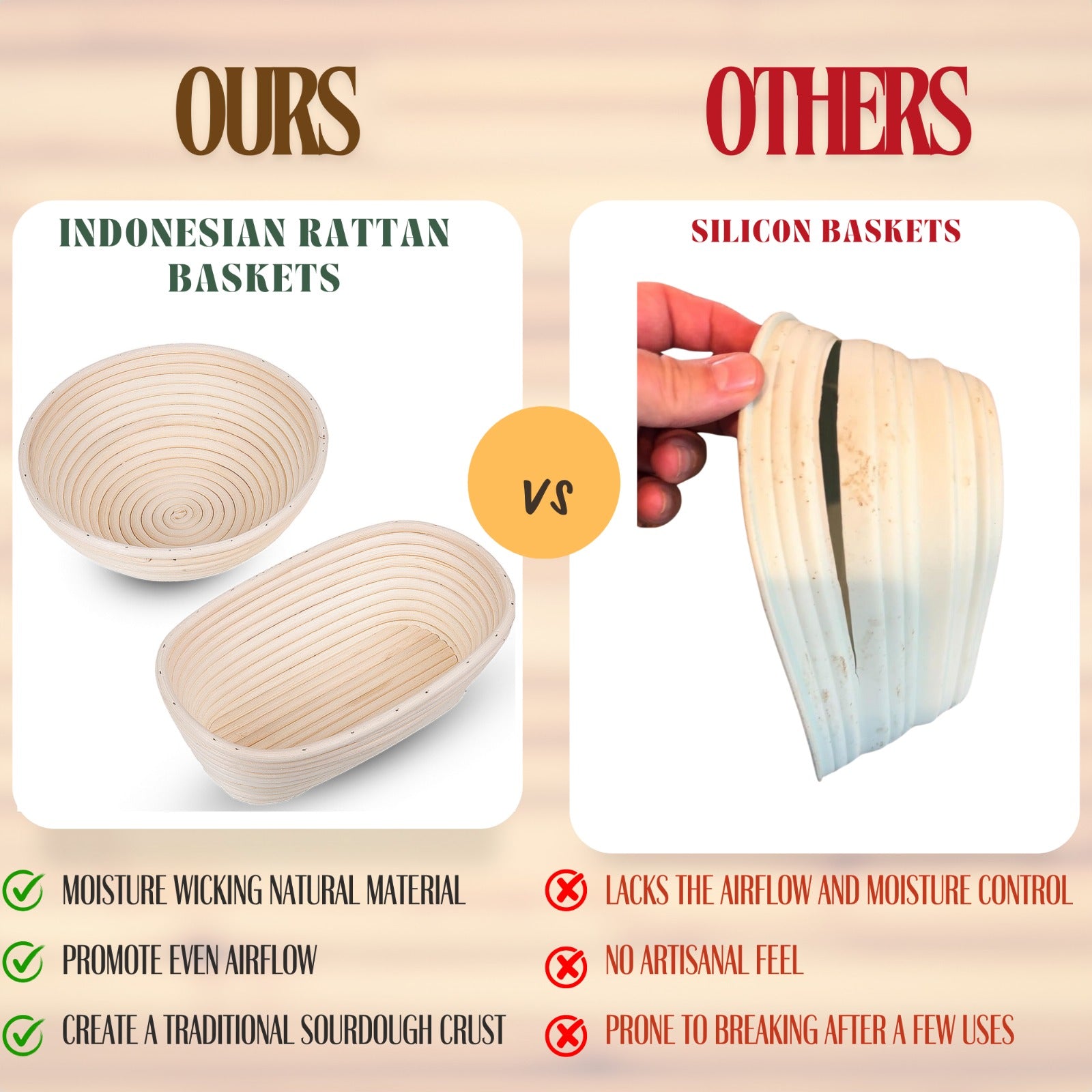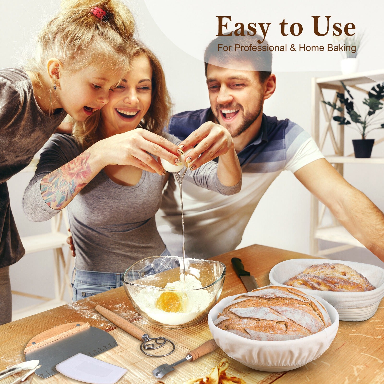 Superior Handmade Indonesian Rattan Basket: Our Banneton sourdough bread proofing basket is handmade traditionally from premium natural A-grade Indonesian rattan canes. These natural materials absorb excess moisture to improve the texture and taste of your artisan bread. Premium Banneton Bread Proofing Basket: Ideal 9 inch Round and 10 Oval basket, holds up to 2 lbs of dough perfect for making delicious and healthy, sourdough Proofing bread. Durable and Eco-Friendly: Proofing baskets for Sourdough bread baking. They offer a natural scent, heavy-duty build, and a splinter-free finish. This environmentally friendly bread making kit can be used for an extended period when well-maintained. Sourdough Bread Baking Kit: 2 Banneton Baskets with Liner clothes + 1 Linen Bread Bag+ 16 Pcs Stencils + 1 Stainless Steel Bread Lame + 1 Stainless Steel Danish Whisk + 1 Stainless Steel Dough Scraper + 1 Plastic Scraper + 5 Spare Blades + Scoring Lame Cover. Easy to Use and Effortless to Clean: Sourdough proofing baskets effectively wick away moisture from the surface, resulting in a beautifully crispy round crust. This leads to reduced stickiness and minimal flour dust accumulation over time, ensuring dough removal and smooth release during the baking process.
